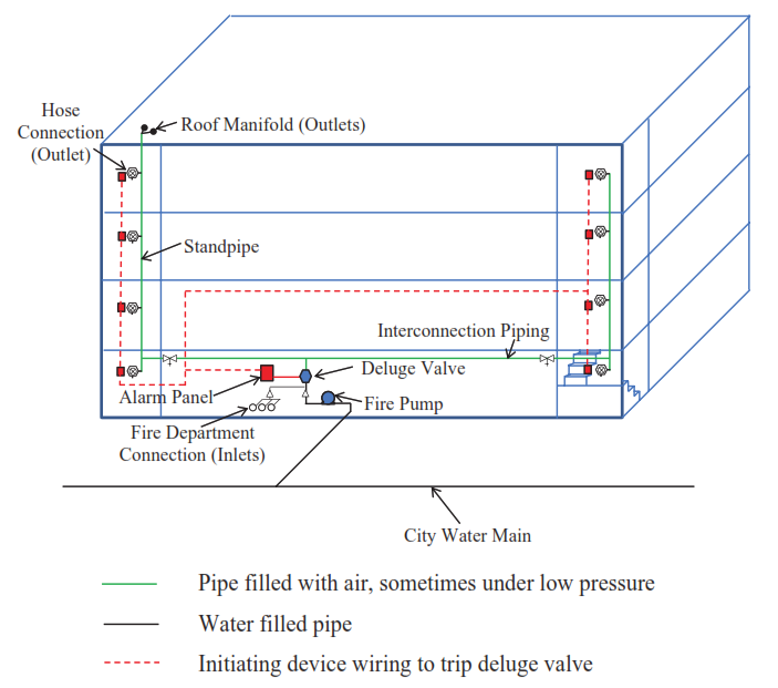La siguiente figura muestra la disposición básica de un sistema de mangueras seco semiautomático con una bomba. Las líneas verdes representan las tuberías que se llenan de aire mientras el sistema está en servicio y listo para ser utilizado. Las líneas negras son las partes del sistema que se llenan de agua. Las líneas rojas discontinuas representan el cableado que conecta los botones o estaciones de activación que se utilizan para iniciar el flujo de agua hacia las conexiones de las mangueras. La figura es de naturaleza esquemática y, para simplificar, no muestra todos los componentes necesarios de un sistema de protección contra incendios, como el recinto de la sala de bombas. Dado que el agua no llena las tuberías del sistema hasta las conexiones de las mangueras, los sistemas secos semiautomáticos pueden instalarse en edificios que no disponen de calefacción. La única parte de la tubería que debe instalarse en una zona con una temperatura mínima de 4 °C es la que va desde el suministro de agua hasta la válvula de preacción.
